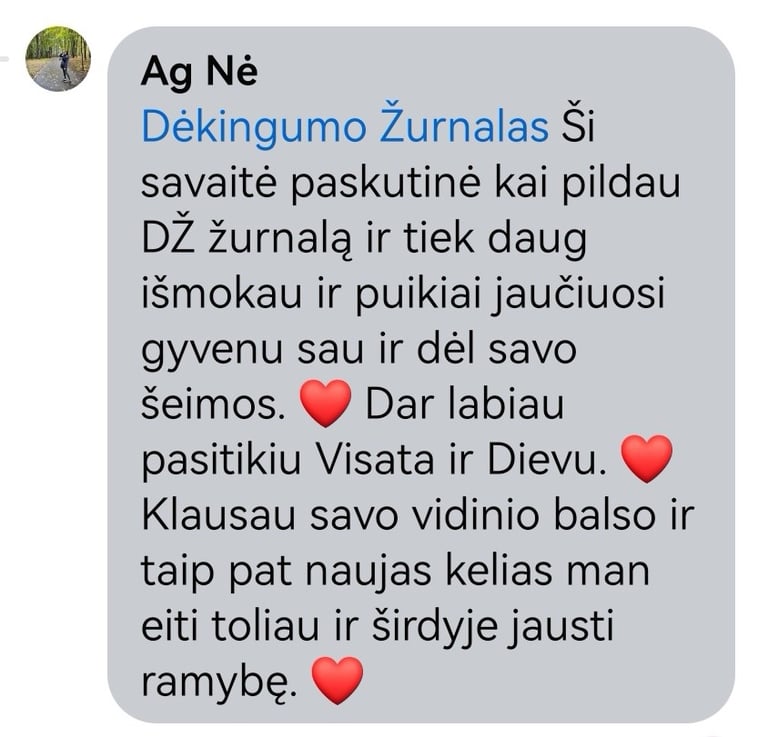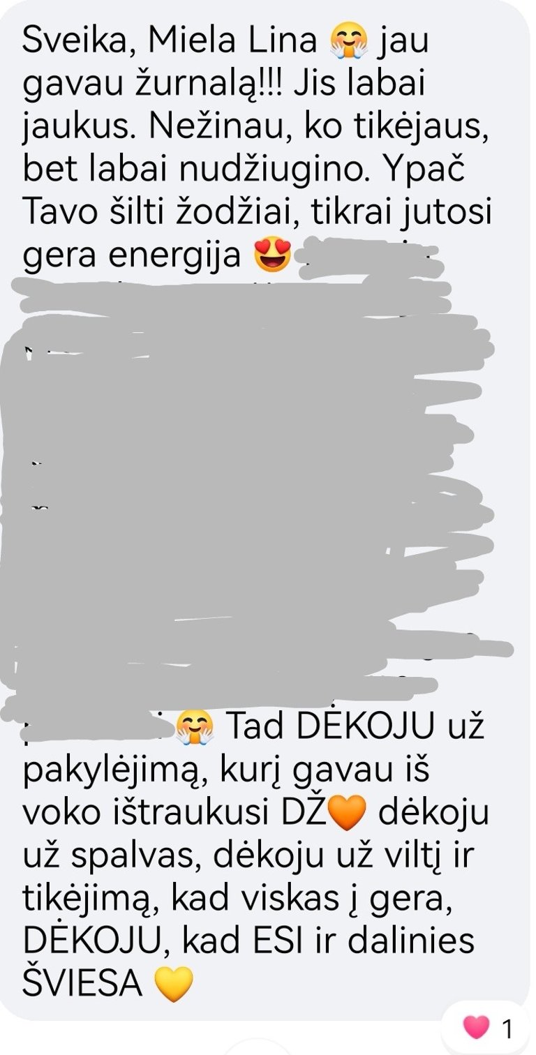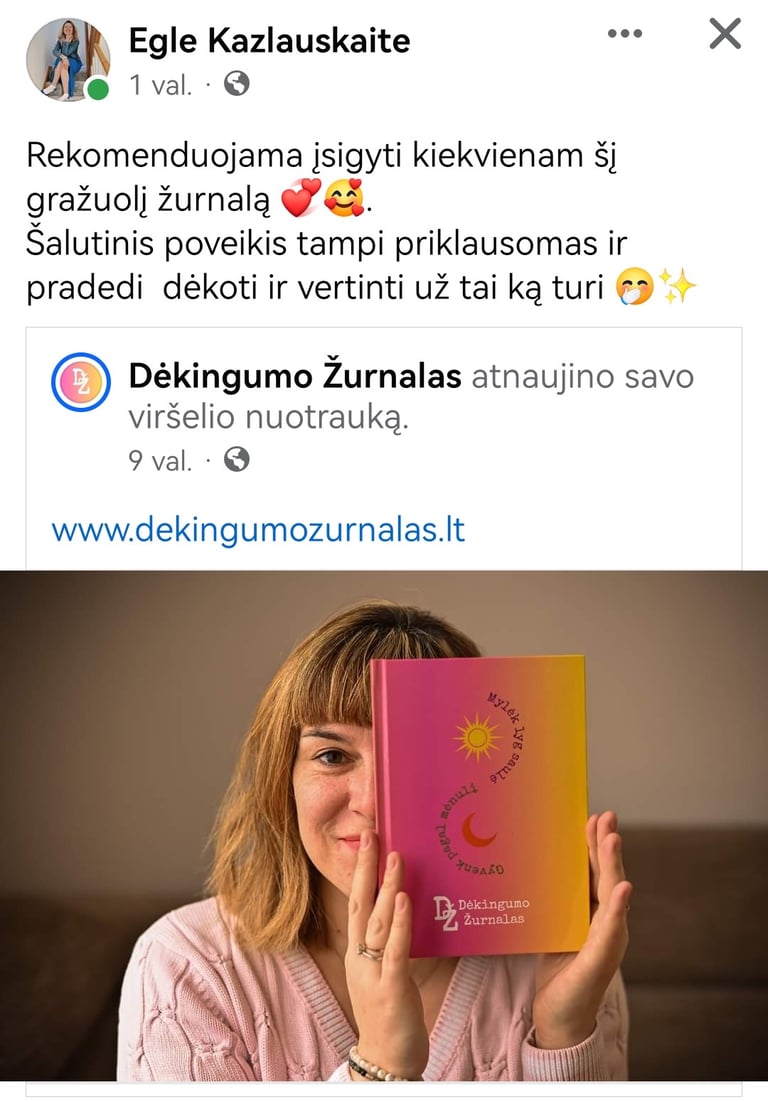 "Prieš naudojant DĖKINGUMO ŽURNALĄ, būdavau linkusi žvalgytis į savo praeities klaidas, o tai trukdė man sutelkti dėmesį į dabartį. Pasinaudojusi draugės rekomendacija išbandyti DŽ, nusprendžiau pabandyti. Širdis džiaugiasi, nes DŽ iš tiesų keičia mano gyvenimą. Esu dėkinga už suformuotą naują įprotį ir tikrai rekomenduoju jį išbandyti."