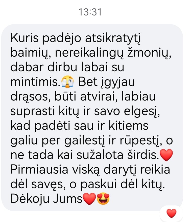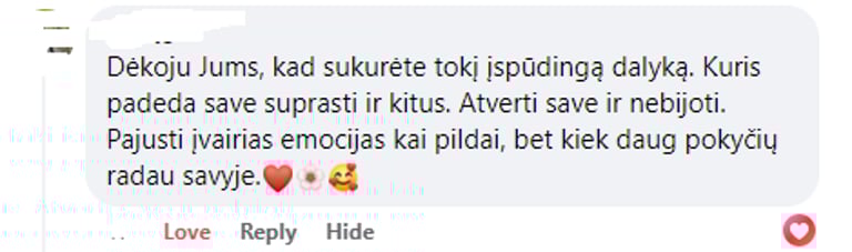 Tai padėjo man suvokti, kiek daug gero yra mano gyvenime, ir suformavo teigiamą požiūrį į kasdienius iššūkius. Dabar jaučiuosi stipresnė ir lengvai siekiu savo tikslų."